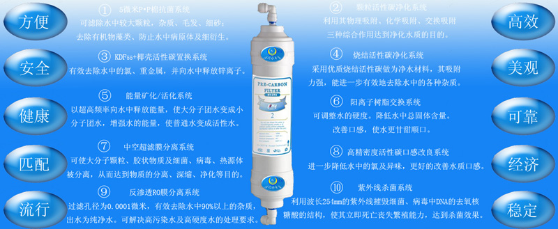 四:能量矿石滤芯。内含多种矿物微量元素,能以299000千次/秒的超高频率向水中释放能量,可使大分子团水变成小分子团水,使水的能量得到加强,使普通水变成活水、自然水、最接近人体细胞水。