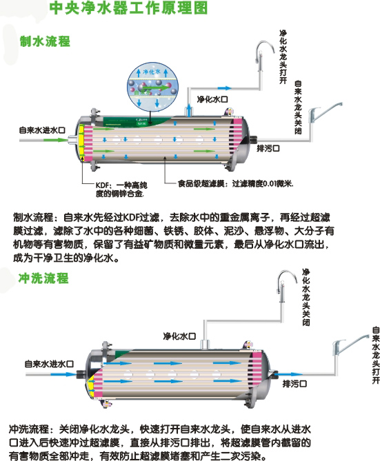 进口KDF铜锌合金滤料+椰壳活性炭C+中空纤维超滤膜核心过滤技术组合,过滤精度最高达0.01微米,全面去除水中铁锈、颗粒杂质、胶体、细菌病毒、异色异味、重金属和氯化物等有害物质,保留活性氧,可满足大量饮用水净化需要。