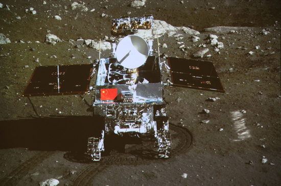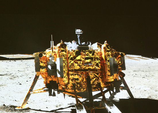 来自中国月球车车身上的这一图像,是由当天凌晨释放它的着陆器拍摄的。23时许进行的首次互拍成像试验中,着陆器和月球车用各自携带的相机互拍。照片显示,在虹湾地区布满砾石和尘埃的灰黑色月面上,着陆器被阳光照得一片金色,月球车“胸前”的五星红旗鲜艳夺目。